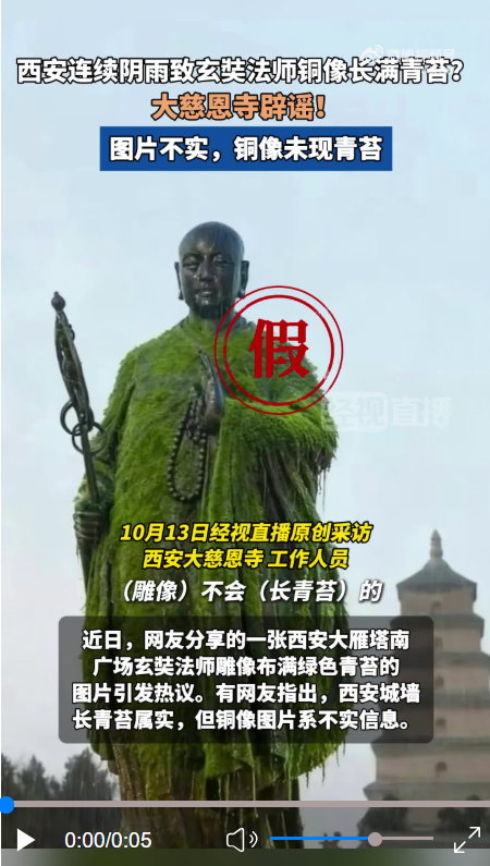 近日免息配资炒股,有网民发文称,西安连续下雨导致城墙长了青苔,并附了一张大雁塔南广场玄奘法师雕塑也布满绿色青苔的图片,引发网络热议。有网民指出,城墙长青苔属实,但玄奘法师像的图片疑为不实信息。